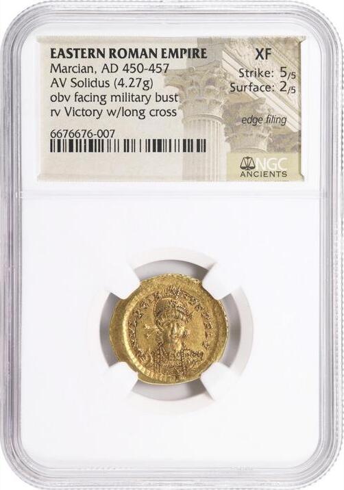 MARCIAN, A.D. 450-457. AV Solidus (4.27 gms), Constantinople Mint, 10th Officina. NGC EF, Strike: 5/5 Surface: 2/5. Edge Filing.