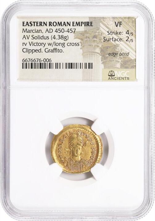 MARCIAN, A.D. 450-457. AV Solidus (4.38 gms), Constantinople Mint, 6th Officina. NGC VF, Strike: 4/5 Surface: 2/5. Clipped, Graffito, Edge Bend.