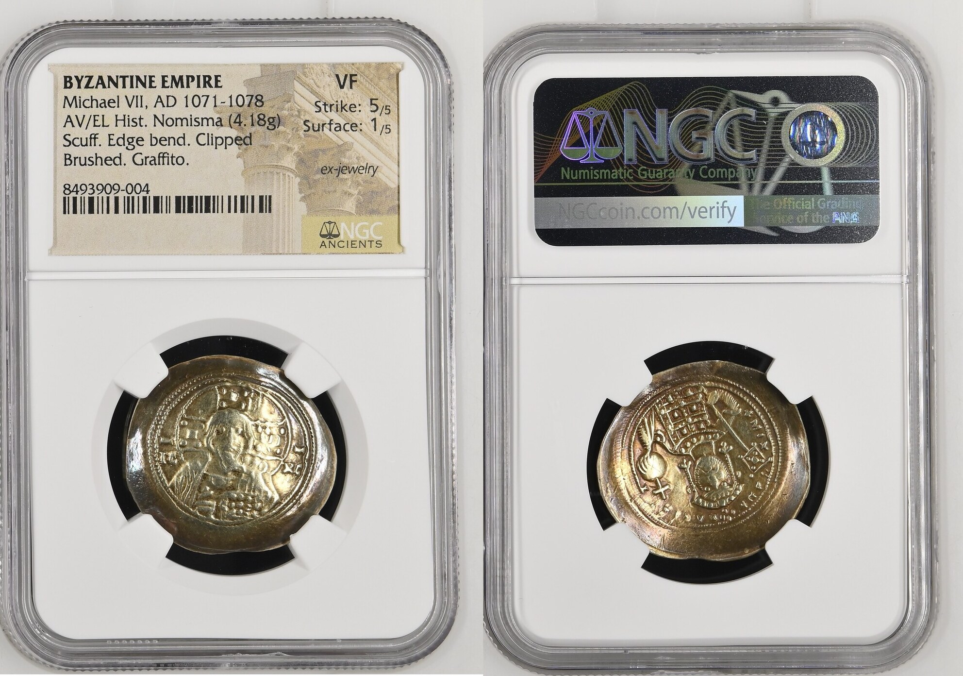 MICHAEL VII, 1071-1078. EL Histamenon Nomisma (4.18 gms), Constantinople Mint. NGC VF, Strike: 5/5 Surface: 1/5. Scuff, Edge Bend, Clipped, Brushed, Graffito, Ex-Jewelry.