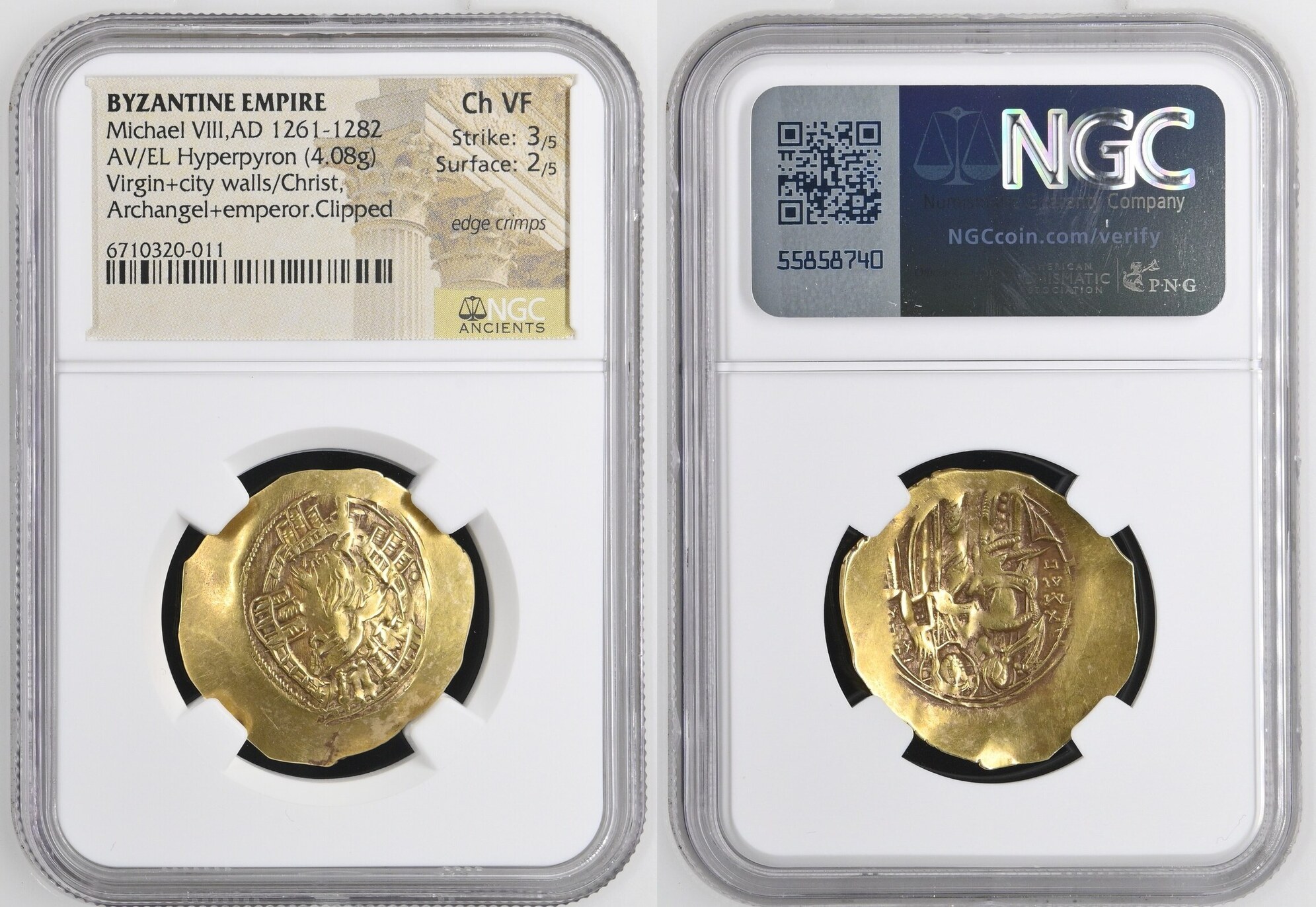 MICHAEL VIII, 1261-1282 (EMPEROR OF NICAEA 1258-61). AV/EL Hyperpyron (4.08 gms), Constantinople Mint. NGC Ch VF, Strike: 3/5 Surface: 2/5. Clipped, Edge Crimps.