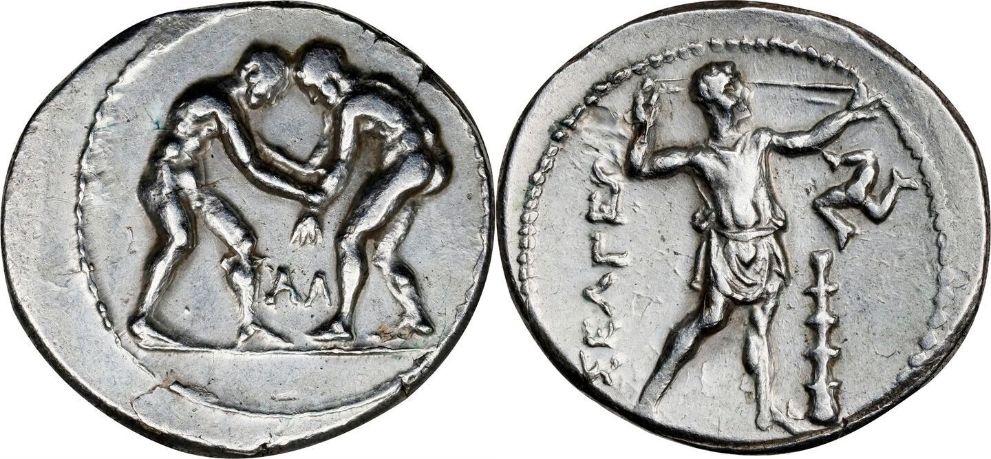 SNG BN-unlisted. Obverse: Two wrestlers grappling; ΑΛ between; Reverse: Slinger in throwing stance right; to right, triskeles above club.