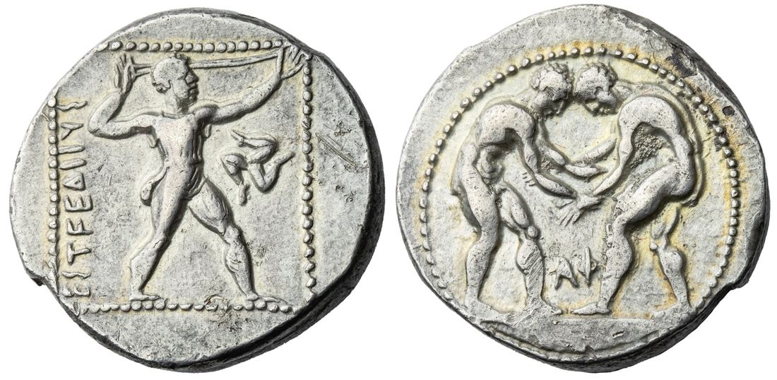 Pamphylia, Aspendos, AR Stater, struck c. 420-370 BC, two wrestlers grappling, alpha-phi between, rev. ESTFEDIIYS, slinger in throwing-stance right, clockwise triskeles to right, all within square dotted border, 10.75g (SNG France 3, 83), small scratch to reverse, lightly toned with golden hues, about very fine