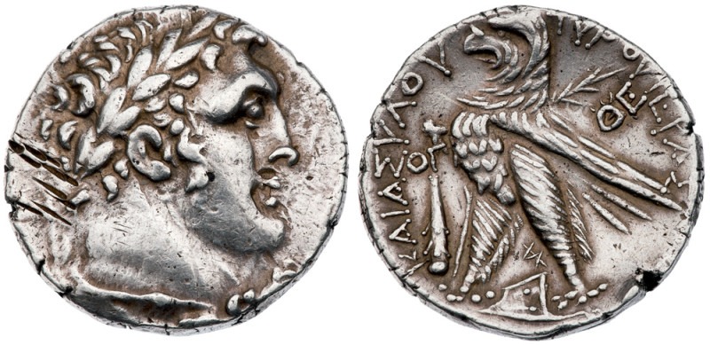 Laureate head of Melkart right. Reverse: Eagle standing left on prow, palm frond over shoulder, date OΓ above club at left,ΘE monogram at right, Phoenician letters TA between legs. BMC 165 (different monogram andletter). Test marks obverse left periphery. Otherwise Good Very Fine.