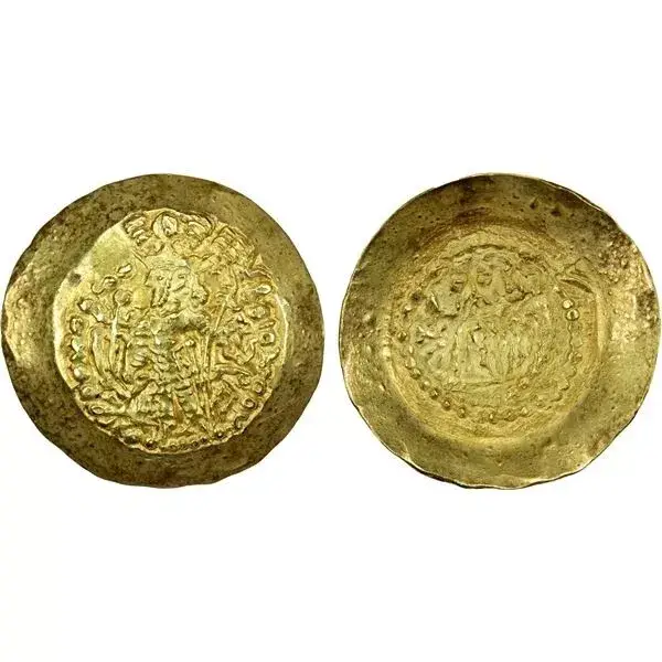 Conclusion: The Kidarite scyphate AV dinar is a remarkable artifact that encapsulates the confluence of cultural and religious traditions in late antiquity Central Asia. Its well-preserved state and bold strike make it a significant piece for collectors and scholars alike, offering a glimpse into a lesser-known yet fascinating period of history.