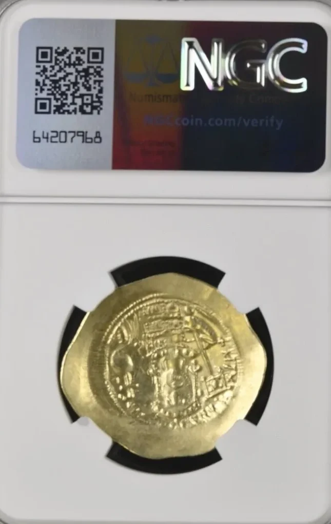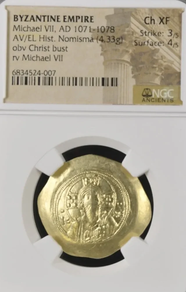 Description and Collectibility: This solidus features Christ Pantocrator on the obverse and a detailed portrait of Michael VII Ducas on the reverse. The coin is certified as Choice XF by NGC, reflecting well-preserved detail with minimal wear. The distinctive scyphate (cup-shaped) form of this coin adds to its historical significance.