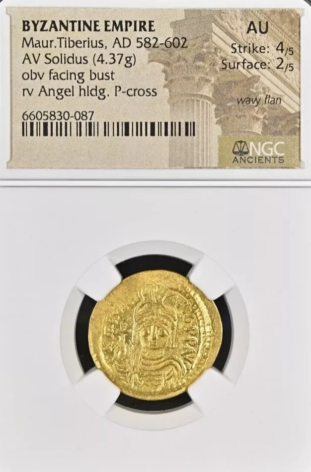 Description and Collectibility: This solidus features Maurice Tiberius in full imperial regalia on the obverse, with an angel symbolizing divine favor and victory on the reverse. The coin is certified as AU by NGC, indicating it retains much of its original detail despite a wavy flan.