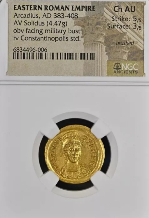 – **Design:** Pearl-diademed, helmeted, and cuirassed facing bust of Arcadius, head turned slightly right, spear in right hand over shoulder, shield decorated with horseman motif in left hand.