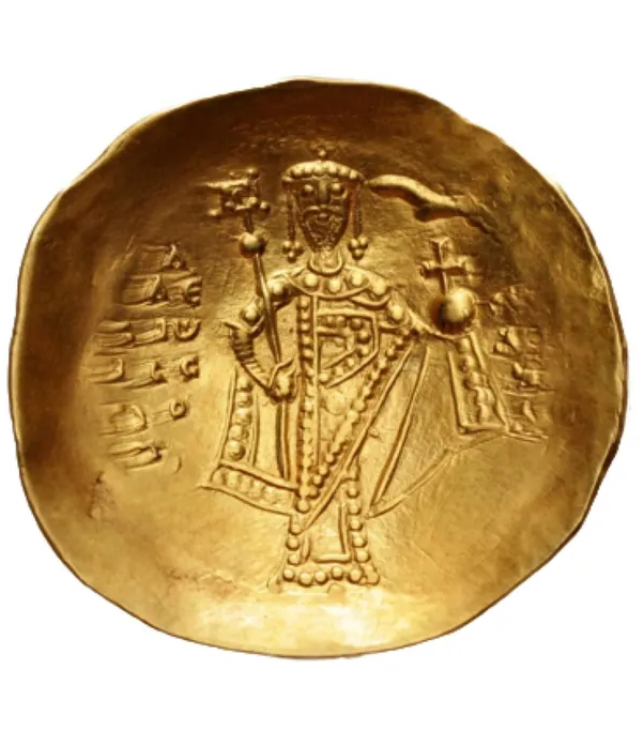 The hyperpyron, introduced by Alexius I, was a significant reform in Byzantine coinage aimed at restoring economic stability. The obverse design of Christ Pantokrator symbolizes the divine endorsement of Alexius’ rule, while the reverse showcases the emperor’s authority and divine right to rule, emphasized by the manus Dei.
