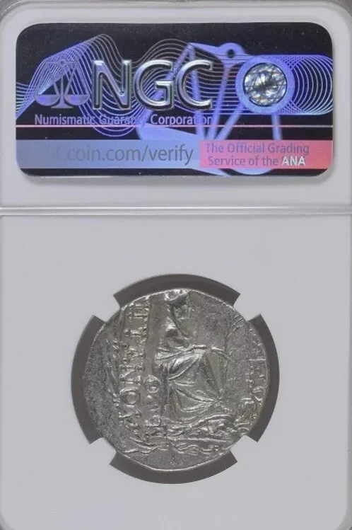 • Design: BAΣIΛEΩΣ / TIΓPANOY, depicting Tyche seated on a rock to the right, holding a palm branch. The river god Orontes is shown swimming right before Tyche. Above, the OTY monogram and ΣΩ monogram on the rock. The coin is surrounded by a laureate border.