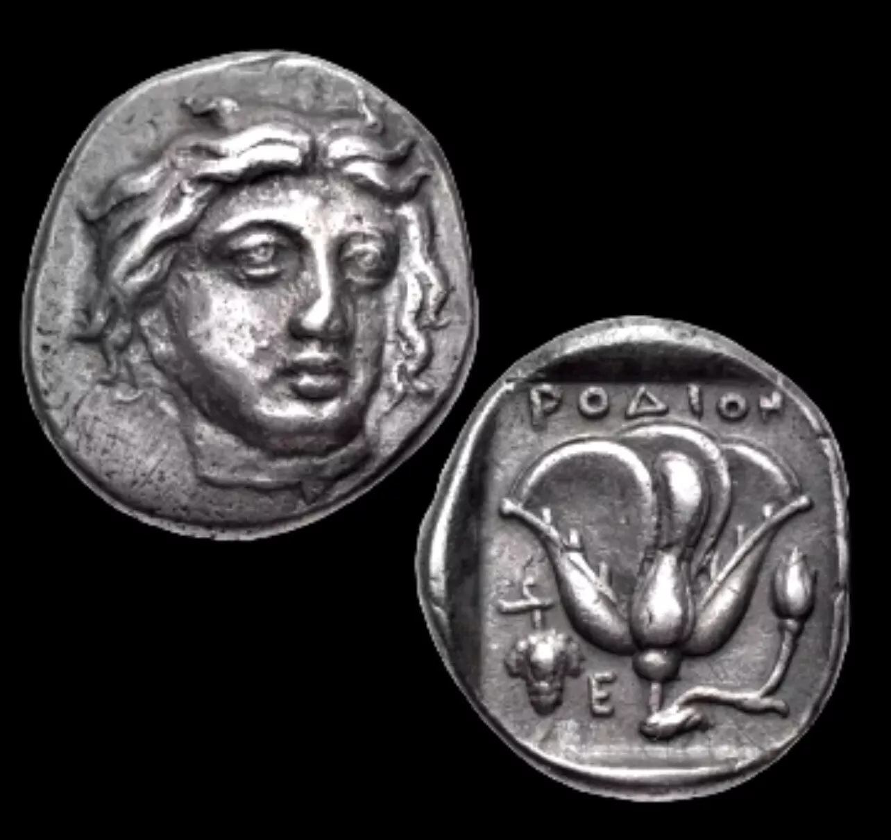 - Design: Head of Helios facing slightly right. Helios is depicted with a strong presence, typical of Rhodian coinage during this period.