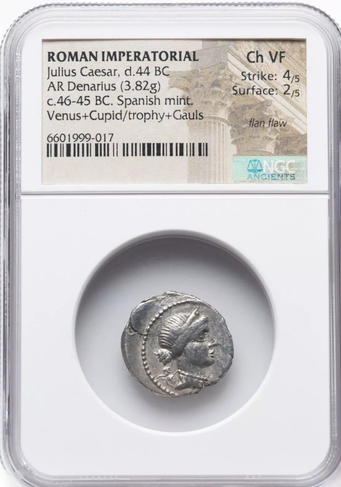 - Strike: Clear design with strong iconography of Venus and the trophy, though the flan flaw affects the presentation.