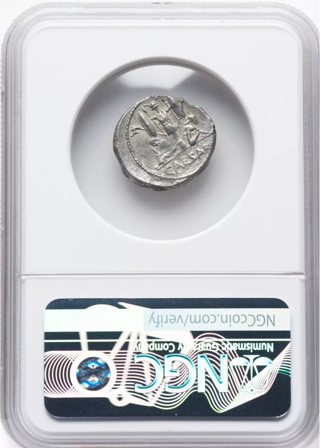 - Design: Trophy of Gallic arms with captives seated at its base. To the left, a dejected female captive and to the right, a bound male captive looking up at the trophy, highlighting Caesar’s military victories and triumphs over the Gauls.