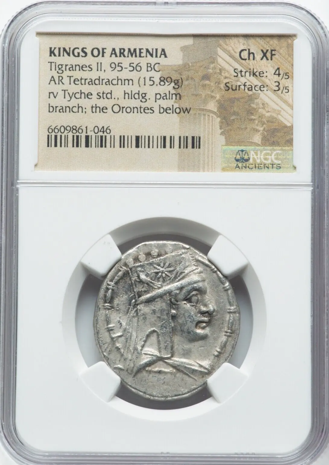 - Surface: Choice XF with well-preserved details. The coin displays strong design elements and a clear depiction of both Tigranes II and the reverse motifs, although with some surface wear consistent with the grade.