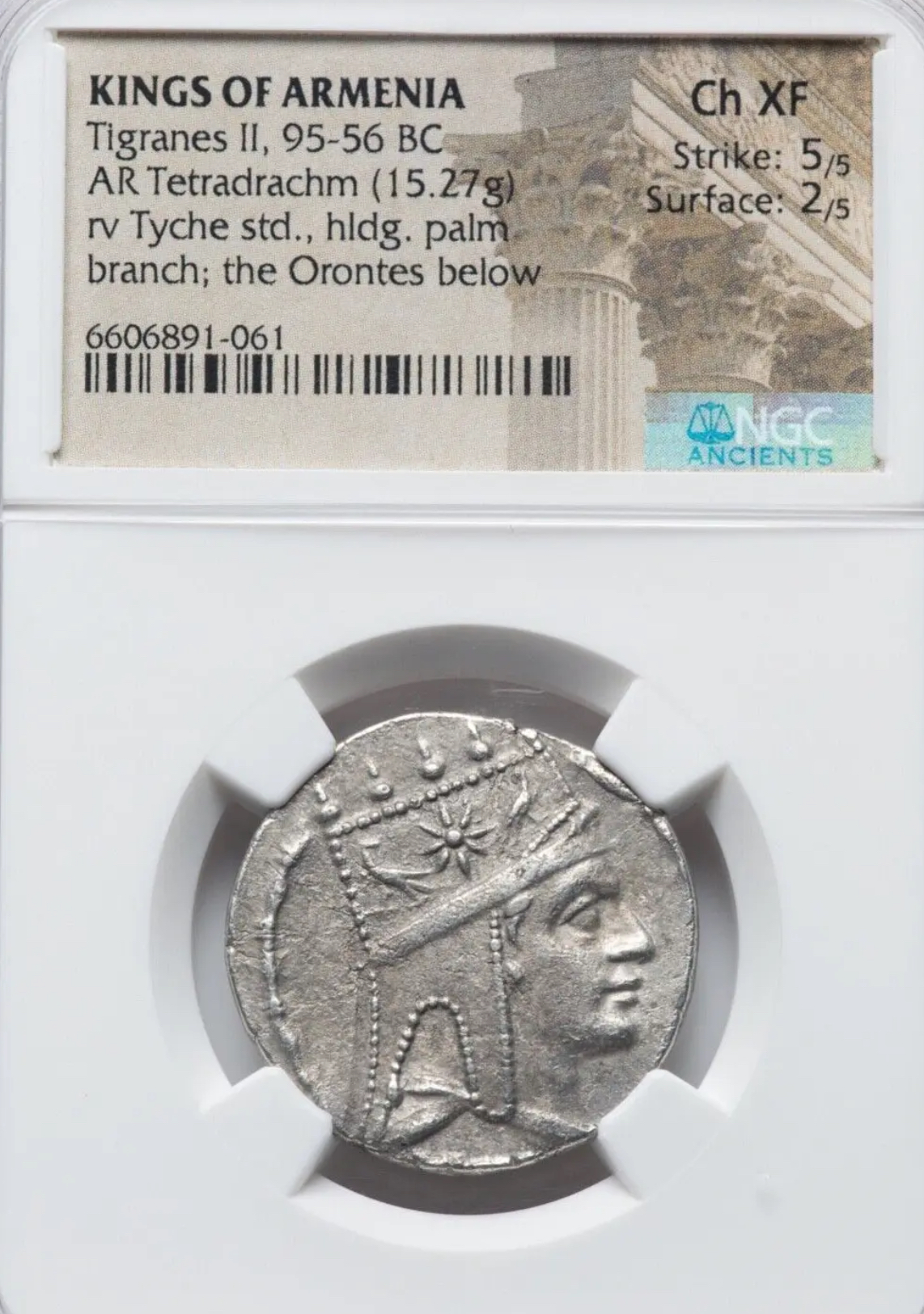 – **Design:** Diademed and draped bust of Tigranes II right, wearing a tiara with starburst between eagles standing outward looking inward, within a bead-and-reel border.