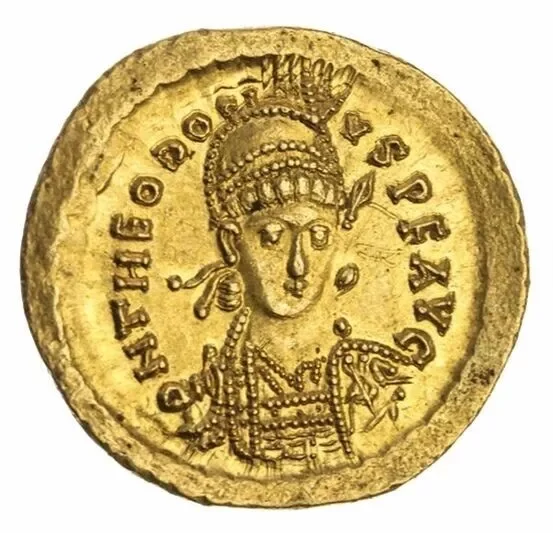 - Design: Armoured bust of Theodosius II facing, wearing a pearl-diademed helmet and holding a spear over his shoulder.