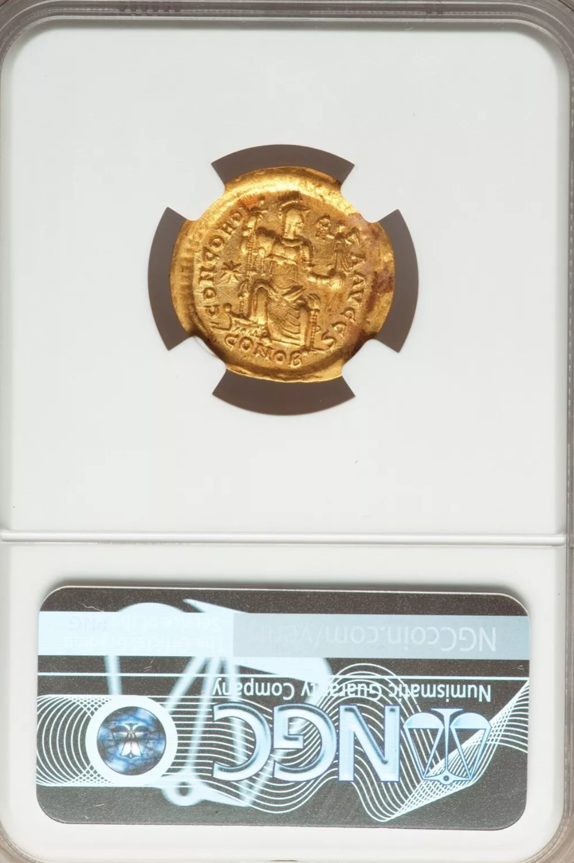 This solidus from the reign of Theodosius II showcases the emperor’s military and imperial regalia, symbolizing strength and stability. The reverse features Constantinopolis, emphasizing the importance of the city during his reign.