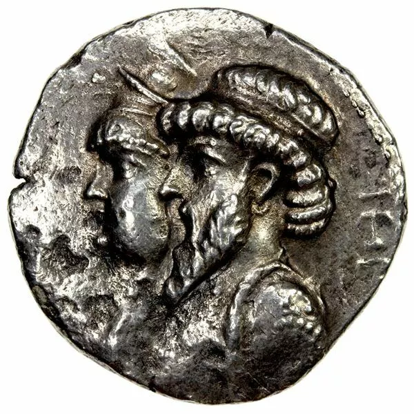 - Design: Jugate draped busts of Kamnaskires III, diademed, and Queen Anzaze, wearing a stephane (a crown or headdress). An anchor is depicted behind the busts.