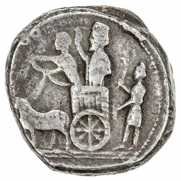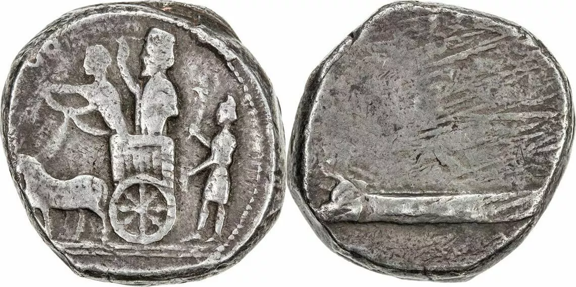 - Design: Features the Persian king and driver in a chariot moving left, with an attendant following behind, holding a vase and a scepter topped with an animal’s head. The ‘ayin ‘ayin mark to the upper left is a distinctive feature of this coinage.