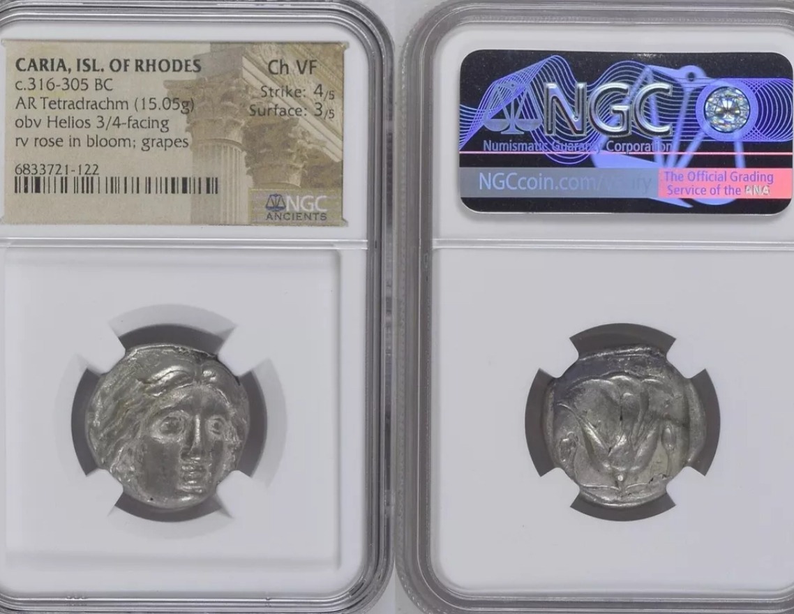 – **Characteristics:** The coin is in Choice VF condition with clear details on the head of Helios and the floral elements on the reverse. Some wear and minor imperfections are consistent with the VF grade but do not detract significantly from the coin’s overall appeal.
