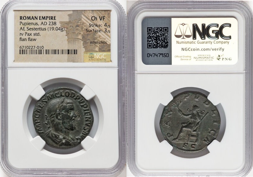 Pupienus (April-July AD 238). AE sestertius (30mm, 19.04 gm, 12h). NGC Choice VF 4/5 – 3/5, edge chips, flan flaw. Rome. IMP CAES M CLOD PVPIENVS AVG, laureate, draped, and cuirassed bust of Pupienus right, seen from behind / PAX-PVBLICA, Pax enthroned left, olive branch upward in right hand, transverse scepter in left; S C in exergue. RIC IV.II 22a. Pleasant jade patina.