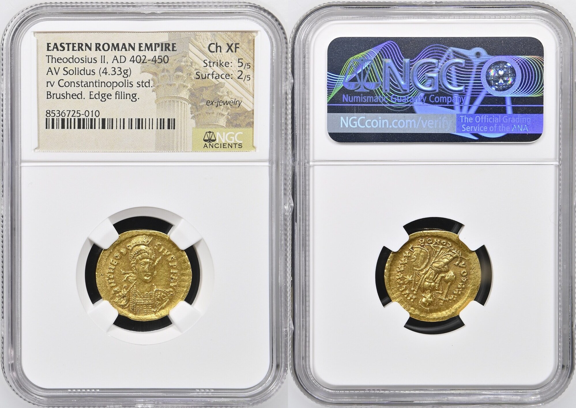 Roman Empire, Theodosius II (AD 402-450), AV Solidus, Constantinople, 3rd Officina, struck c. 430-440, D N THEODOSIVS P F AVG, helmeted, pearl-diademed and cuirassed bust facing, head slightly right, holding spear over his shoulder in right hand, and a shield, decorated with a horseman spearing a fallen foe, on his left shoulder, rev. VOT XXX MVLT XXXX G, Constantinopolis enthroned left, resting left foot on prow of galley, holding globus cruciger in her right hand, and a sceptre in her left, resting elbow on shield, 4.33g (RIC 257; Depeyrot 81/1), some softening to portrait, very fine, in NGC ‘Ancients’ holder, graded Choice XF [Strike: 5/5, Surface: 2/5] ~brushed, edge filing; ex-jewelry~ (Cert. #8536725-010)