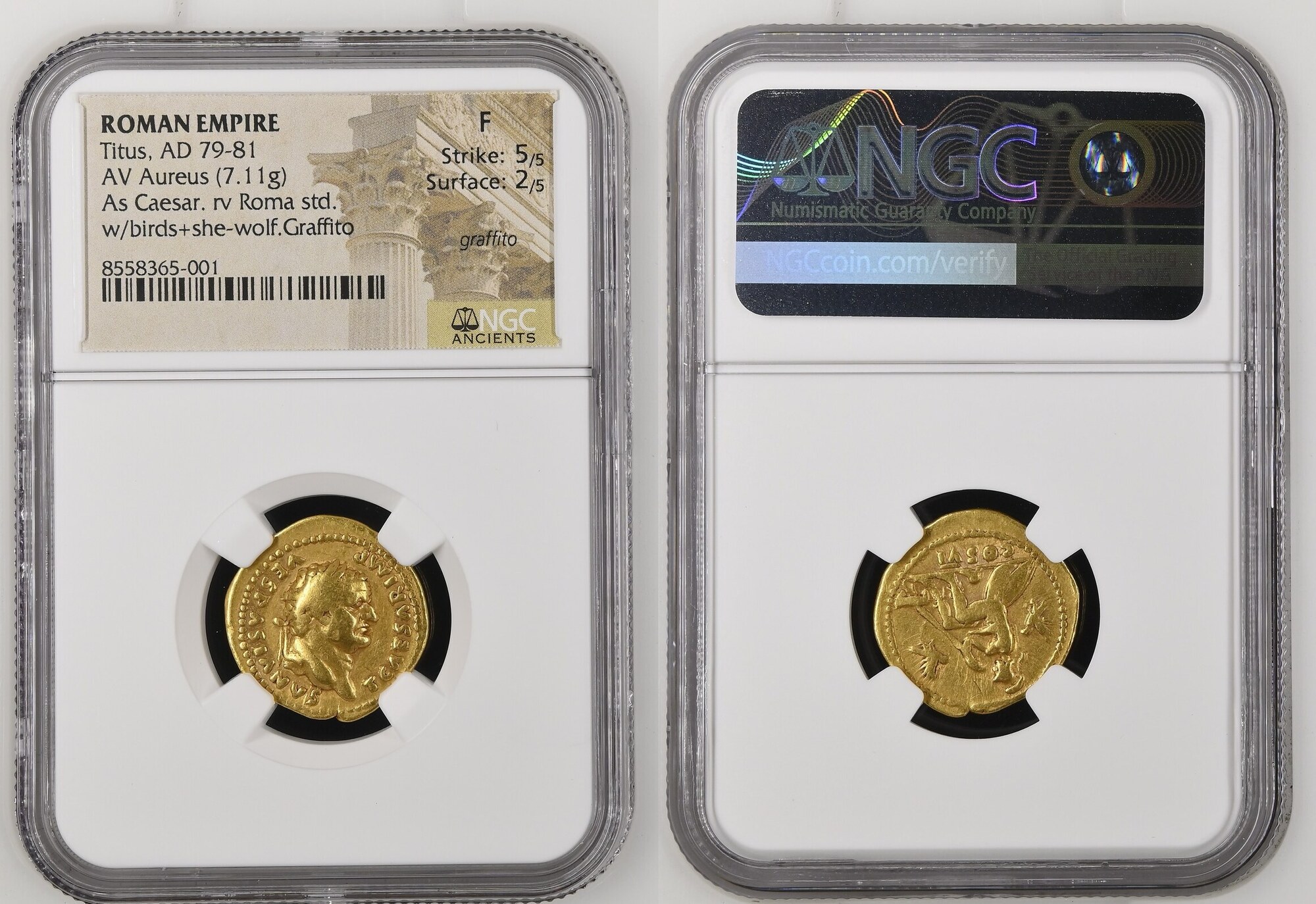 ROMAN EMPIRE: Titus, as caesar, 77-78 AD, AV aureus (7.11g), Rome, 77-78 AD, RIC-954 (Vespasian), laureate head right, T CAESAR IMP VESPASIANVS // Rome seated right on two oval shields, holding spear in left hand, eagle flying to each side, small she-wolf and twins to right, COS VI, small graffito on reverse, Strike 5/5, Surface 2/5, NGC graded Fine, ex Roma Auction 9, Lot 628.
