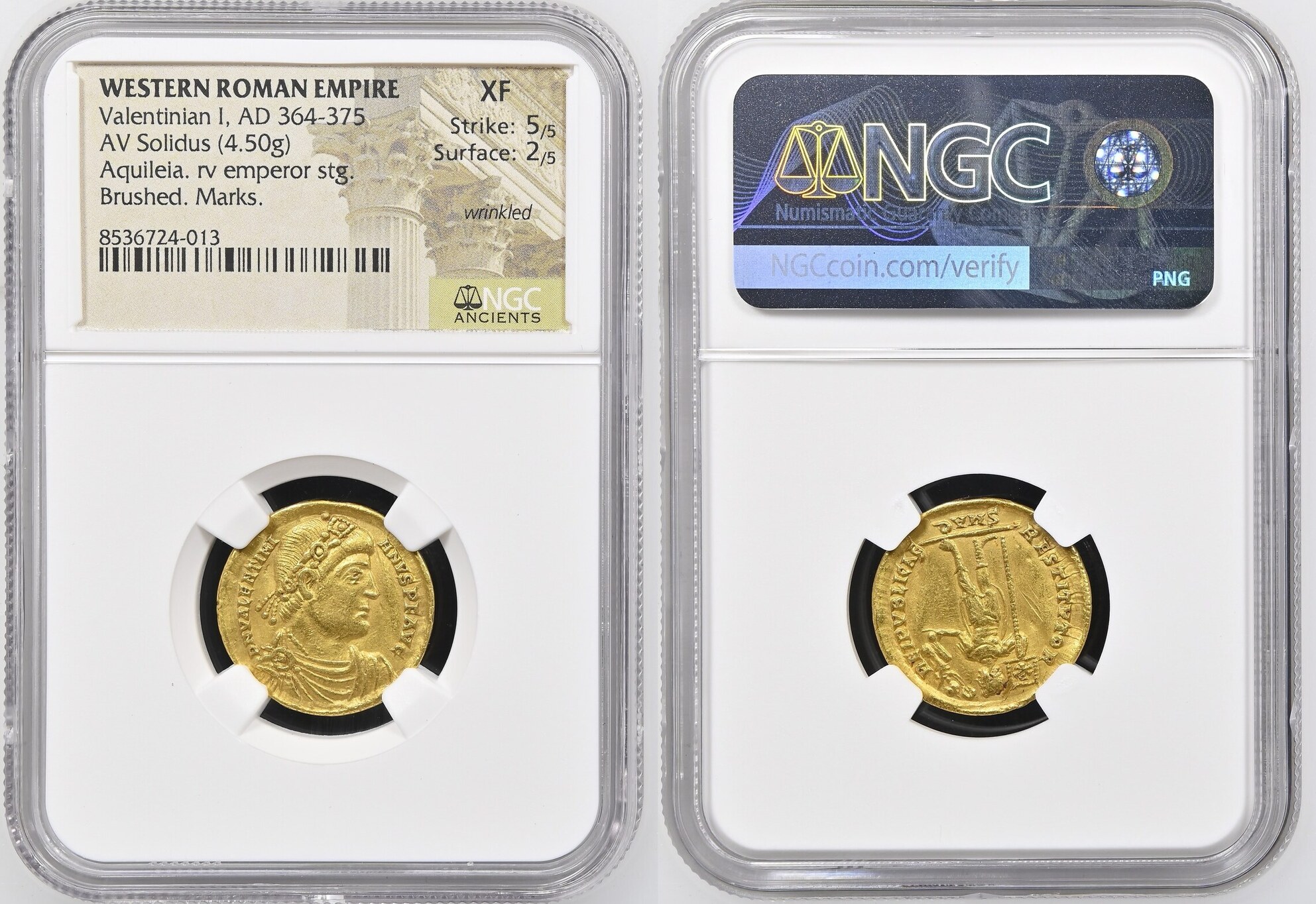 Roman Empire, Valentinian I (AD 364-375), AV Solidus, Aquileia, struck September 364, D N VALENTINIANVS P F AVG, diademed, draped and cuirassed bust right, rev. RESTITVTOR PVBLICAE, emperor standing right holding labarum and Victory on globus, SMAQ in exergue, 4.51g (RIC 2; Depeyrot 12/1), slightly bent and scratched, about very fine, in NGC ‘Ancients’ holder, graded XF [Strike: 5/5, Surface: 2/5] ~brushed, marks, wrinkled~ (Cert. #8536724-013)