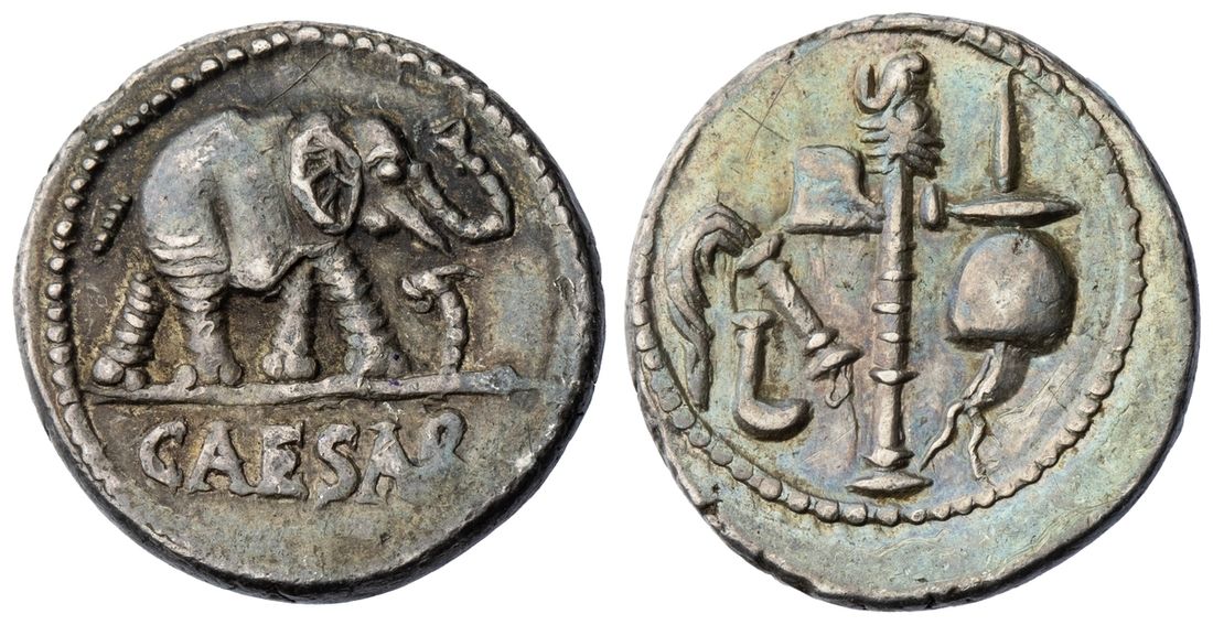 Roman Republic, Julius Caesar, AR Denarius, Military mint travelling with Caesar in North Africa, struck April-August 49 BC, elephant advancing right, trampling horned serpent, countermarked to elephant’s shoulder, CAESAR in exergue, rev. emblems of the pontificate: simpulum, aspergillum, securis, and apex, 3.83g (Crawford 443/1; Sydenham 1006; RBW 1557), toned, well centered, detailed and nicely styled, extremely fine