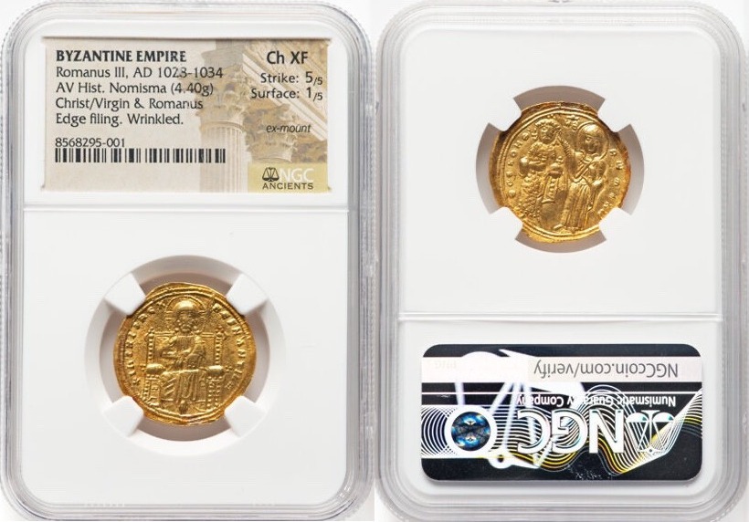 Romanus III Argyrus (AD 1028-1034). AV histamenon nomisma (18mm, 4.40 gm, 7h). NGC Choice XF 5/5 – 1/5, ex-mount, edge filing, wrinkled. Constantinople. +IhS XIS RЄX-RЄϚNANTInm, Christ enthroned facing, wearing nimbus cruciger, pallium and colobium, right hand raised in benediction, book of Gospels in left; double border / ΘCЄ bOHΘ’-RwmAhw, standing facing figures of Romanus III (on left), bearded, wearing crown with pendilia, saccos and loros, four pellets on sleeve, globus cruciger in left hand, and the Virgin (on right), nimbate, wearing pallium and maphorium, crowning emperor with right hand; decorative element over MΘ in central field between their heads, double border. Sear 1819. Amber rim.