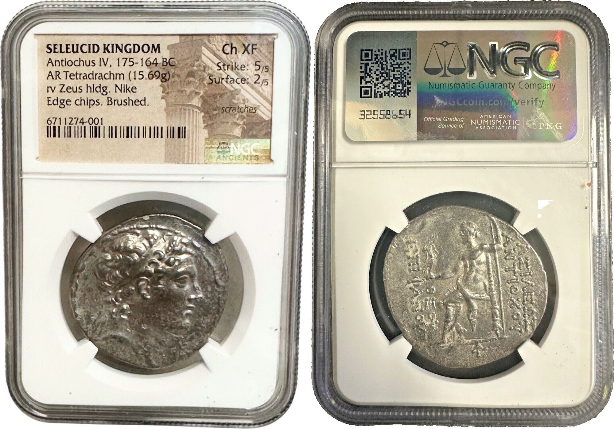 SELEUKID EMPIRE. Antiochos IV Epiphanes. 175-164 BC. AR Tetradrachm (32.5mm, 15.69 g, 12h). Antioch on the Orontes mint. Series 2, circa 173/2-169/8 BC. Diademed head right / Zeus Nikephoros seated left; monogram in exergue. SC 1396a; Le Rider, Antioche, 72A, obv. die A9; HGC 9, 619. Lightly toned, NGC Choice XF.