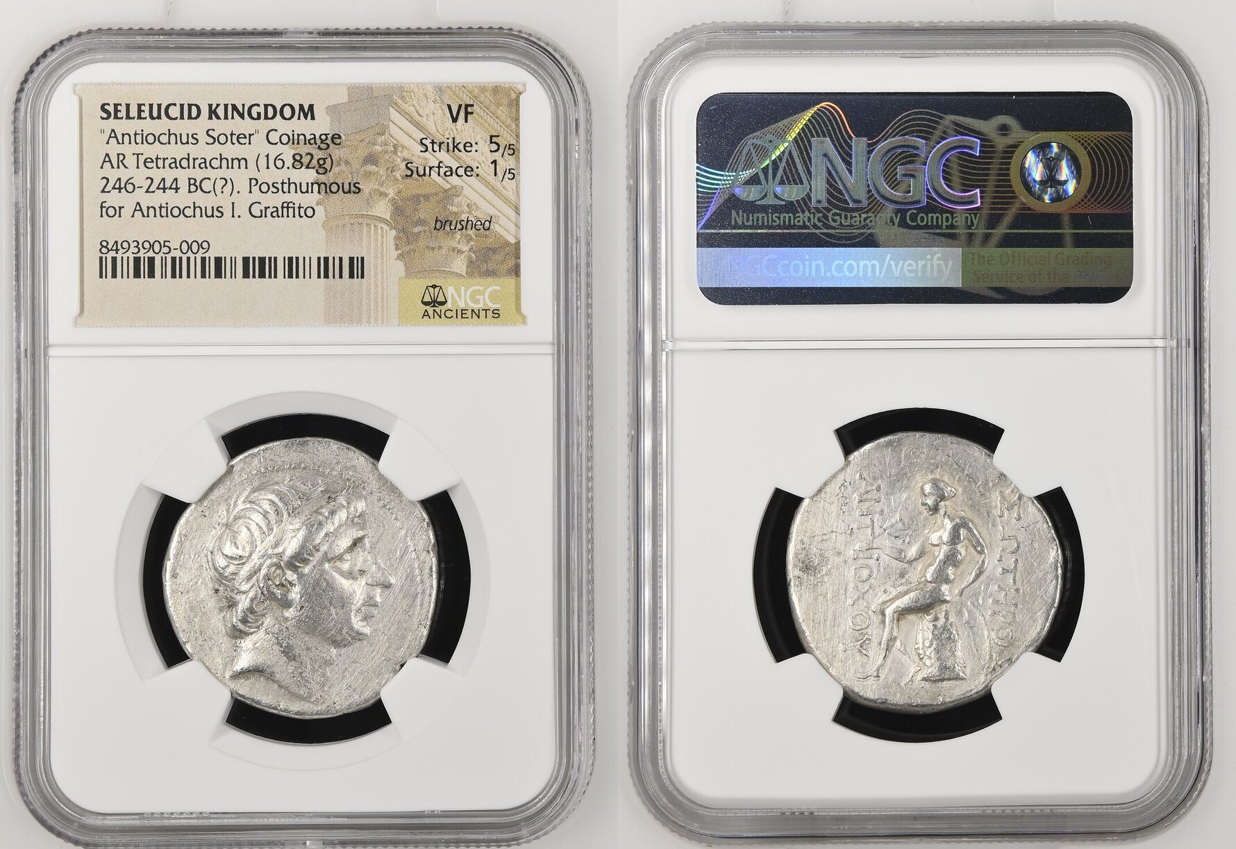 Seleukid Kingdom. “Antiochus I Soter”. AR Tetradrachm (16.82 gms), Antioch on the Orontes Mint, ca. 246-244 B.C.. NGC VF, Strike: 5/5 Surface: 1/5. Brushed, Graffito.