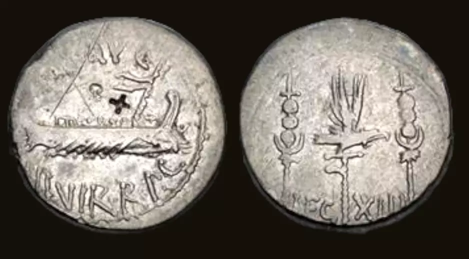 The Triumvirs. Mark Antony. Autumn 32-spring 31 BC. AR Denarius (16.5mm, 3.41 g, 12h). Legionary type. Patrae(?) mint. Praetorian galley right / Aquila between two signa; LEG XIII across lower field. Crawford 544/27; CRI 367; Sydenham 1232a; RSC 42; RBW 1844. Lightly toned, struck slightly off center, a couple of bankers’ marks and graffito on obverse. Near VF.
