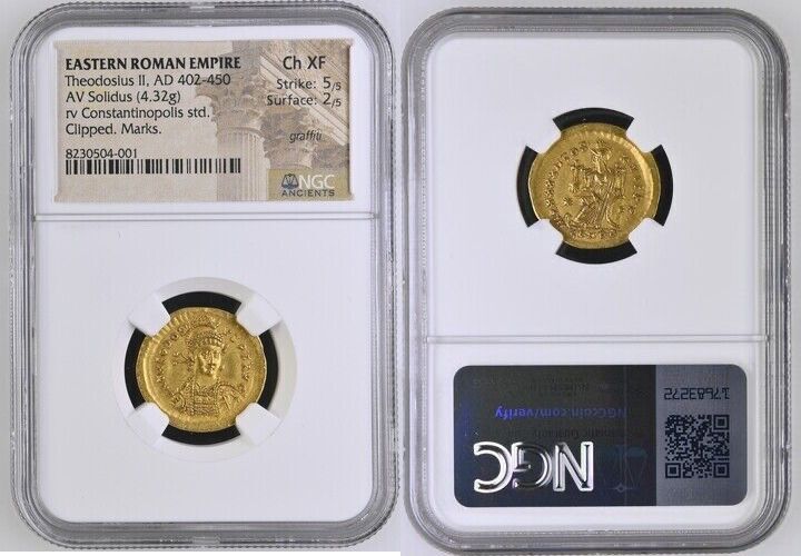 THEODOSIUS II, A.D. 402-450. AV Solidus (4.32 gms), Constantinople Mint, ca. A.D. 441-450. NGC Ch EF, Strike: 5/5 Surface: 2/5. Clipped, Marks, Graffiti.