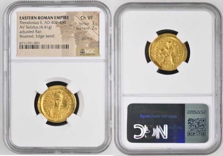 THEODOSIUS II, A.D. 402-450. AV Solidus (4.41 gms), Constantinople Mint, ca. A.D. 441-450. NGC Ch VF, Strike: 3/5 Surface: 2/5. Adjusted Flan, Brushed, Edge Bend, Graffito.