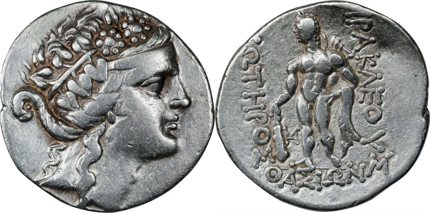 HGC-6, 359. Obverse: Wreathed head of Dionysos right; Reverse: Herakles standing left, holding club and lion skin; monogram to inner left.