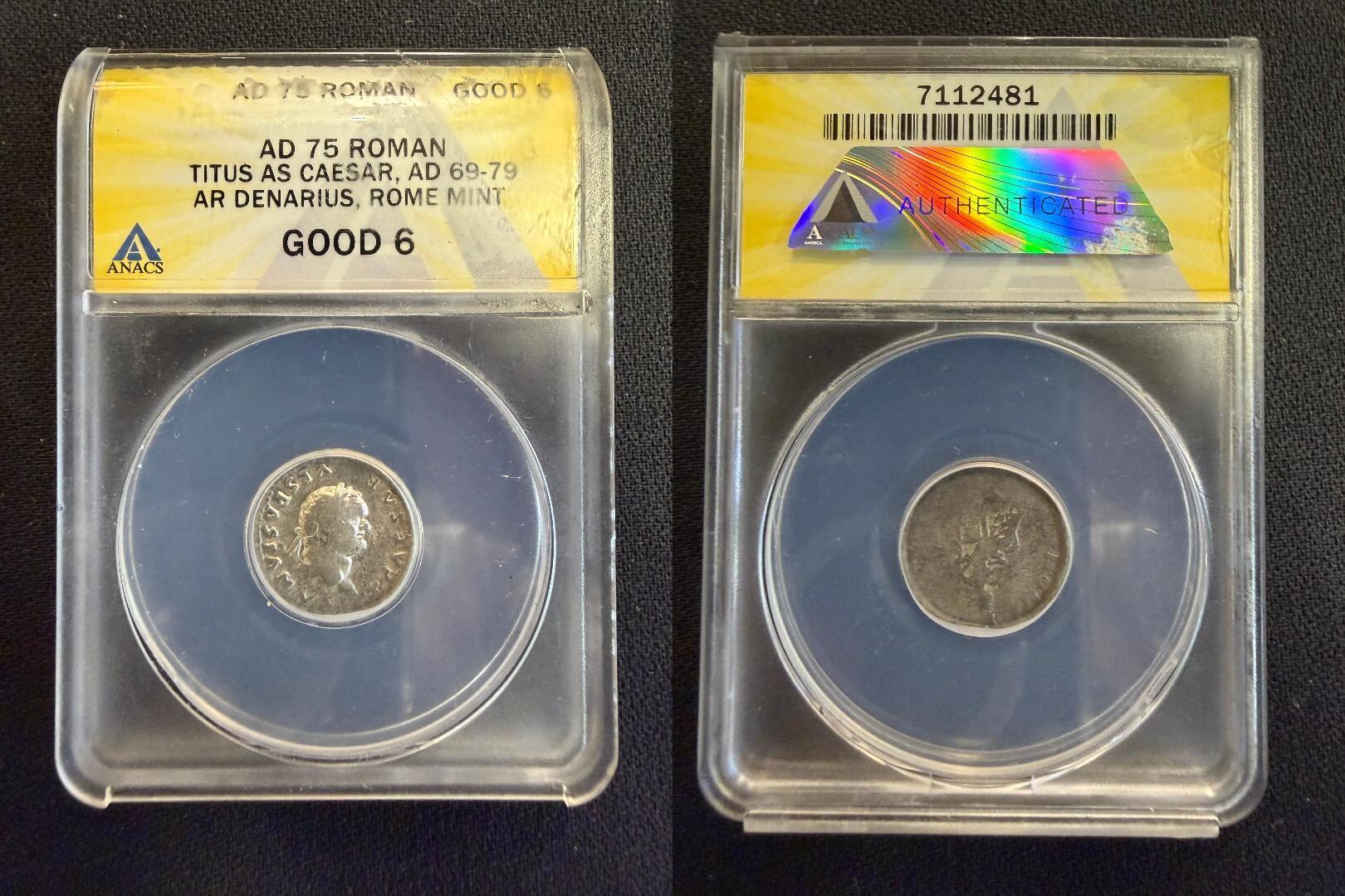 Titus. As Caesar, AD 69-79. AR Denarius (19mm, 6h). Rome mint. Struck under Vespasian, AD 75. Laureate head right / Pax seated left, holding olive branch and resting arm on armrest of throne. RIC II.1 783 (Vespasian); RSC 162.