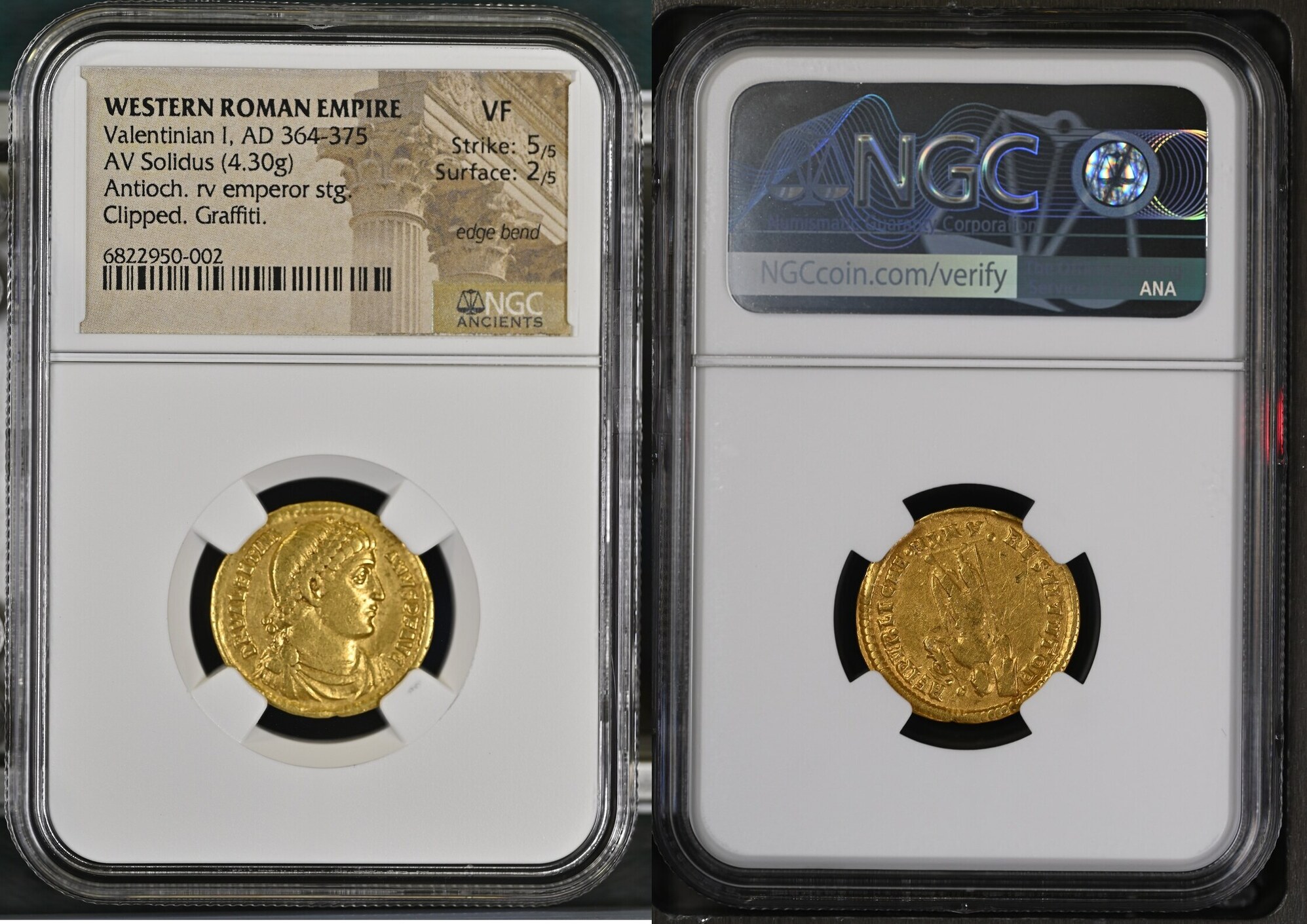 Valentinian I, Western Roman Empire (AD 364-375). AV solidus (20mm, 4.30 gm, 5h). NGC VF 5/5 – 2/5, edge bend, clipped, graffiti. Antioch, 8th officina, ca. 25 February AD 364-24 August AD 367. D N VALENTINI-ANVS P F AVG, pearl-diademed, draped, and cuirassed bust of Valentinian I right, seen from front / RESTITVTOR-REIPVBLICAE, Valentinian standing facing, head right, in military dress, grounded labarum with staurogram on banner in right hand, Victory left on globe in outstretched left hand; ANTH pellet in exergue. RIC IX 2axvi.