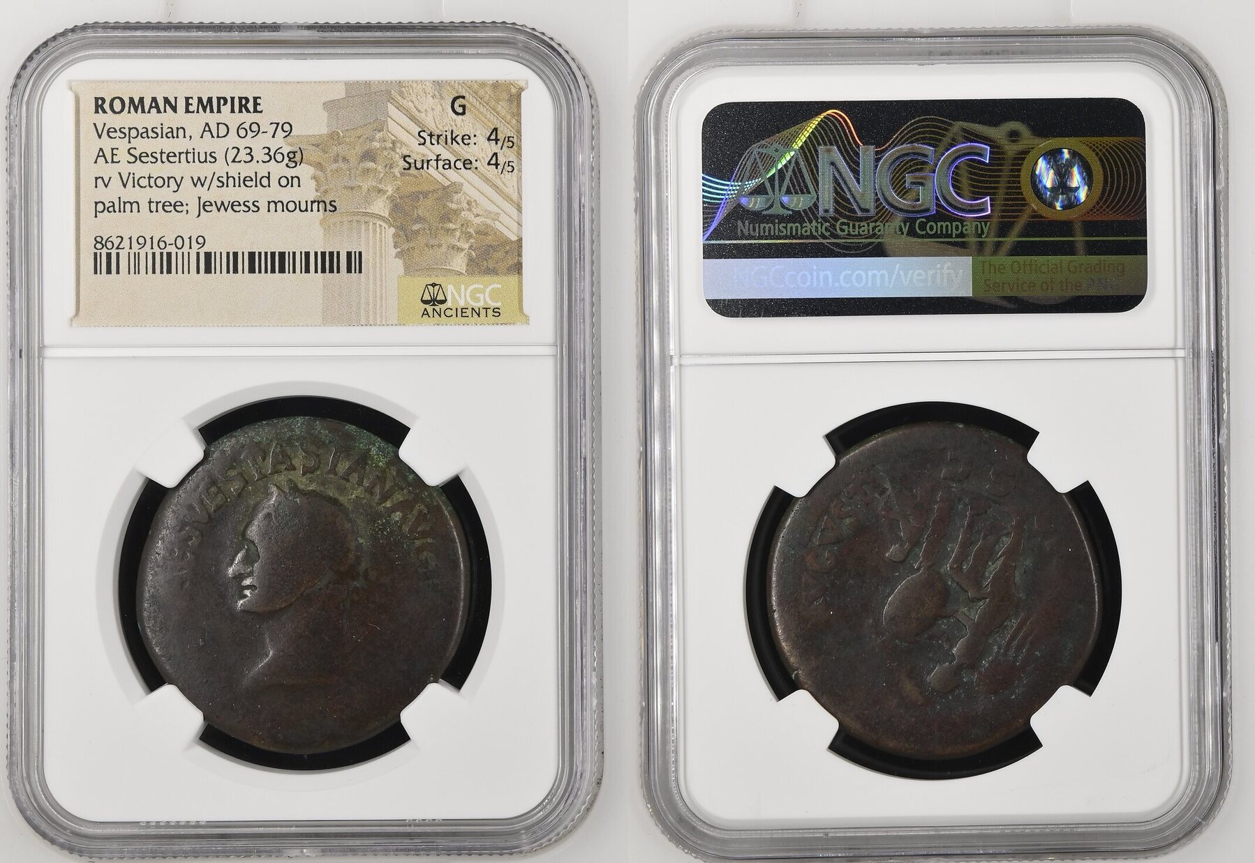 Vespasian. AD 69-79. Æ Sestertius (34mm, 23.36 g, 6h). “Judaea Capta” Commemorative. Rome mint. Struck AD 71. Laureate head left / Victory standing right, left foot on helmet, inscribing shield with right hand set on palm tree; on right, Judaea seated right, in attitude of mourning. RIC II.1 223 (R2); Hendin 6538b. Brown surfaces. Fair. Rare with laureate head left. NGC Good.
