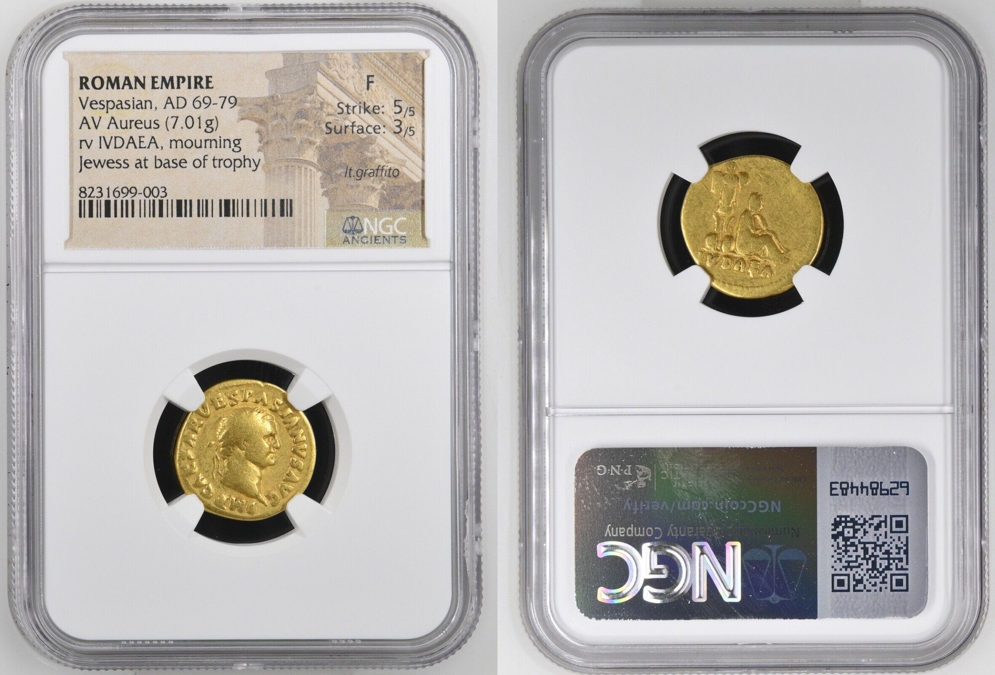 Vespasian. AD 69-79. AV Aureus (18mm, 6.99 g, 6h). “Judaea Capta” commemorative. Rome mint. Struck circa 21 December AD 69-early 70. IMP CAESAR VESPASIANVS AVG, laureate head right / IVDAEA in exergue, trophy; to right, Judaea, veiled and draped, seated right on ground in attitude of mourning, knees drawn up, head resting on left hand, which is propped on knees, right arm on lap. RIC II.1 1; Hendin 6492; Calicó 643; BMCRE 31-4; BN 20-2; Biaggi 324. NGC Fine.
